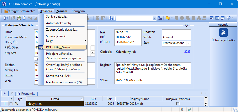 Spustenie správy a konfigurácie POHODA mServer urobíme v programe POHODA v agende Účtovné jednotky, ponukové menu voľba Databáza - povel POHODA mServer.