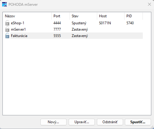 Pre každú vytvorenú konfiguráciu POHODA mServera sú tu uvedené parametre: názov, port, stav spustenia (relácie). Ďalej toto dialógove okno slúži na vytvorenie, editáciu a zmazanie konfigurácie POHODA mServera.