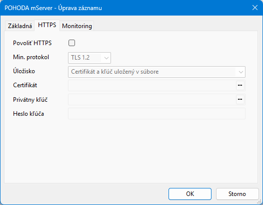 Na záložke HTTPS je možné zapnúť a nastaviť HTTPS komunikáciu mServera.