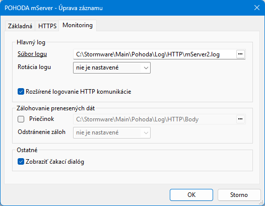Na záložke Monitoring je možné zapnúť a nastaviť Logovanie komunikácie mServera.