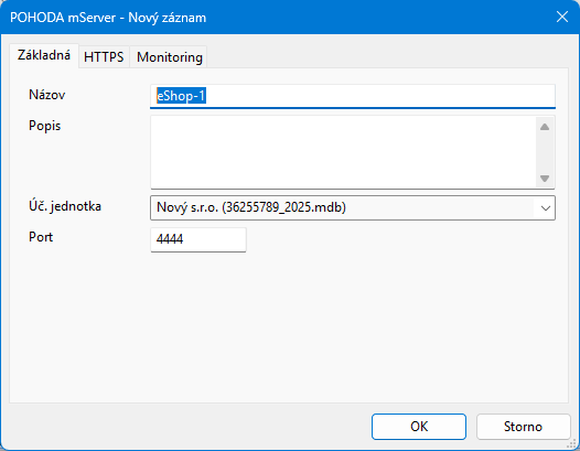 Vytvorenie a nastavenie inštancie mServera vykonáte cez tlačidlo "Nový", ktoré otvorí dialogové okno nastavenia inštancie mServera, kde na záložke "Základná" nastavíte: